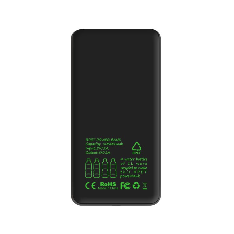 Die CM5144 Powerbank ist aus recycelten Plastikflaschen (RPET) hergestellt, was auf der Rückseite jedes Produkts angegeben ist. Für die CM5144 hat die Fabrik 4 recycelten 1 Ltr. Flaschen verwendet, um eine Powerbank mit einer Kapazität von 10.000 mAh, Eingang 5V/2A und Ausgang 5V/2A herzustellen. Es gibt 2 USB-Anschlüsse, 1 USB-C und 1 Micro USB. Auf der Vorderseite des CM5148 finden Sie eine schöne Textur aus grauem Stoff, die in einer oder mehreren Farben bedruckt werden kann. Um das Geschenk zu vervollständigen, wird die Powerbank in einer Schachtel aus recyceltem Papier verpackt, die einfarbig mit Sojatinte bedruckt ist. Wir sind zuversichtlich, dass Sie mit einer qualitativ hochwertigen, funktionellen und umweltfreundlichen Verpackung Ihre Aufrichtigkeit gegenüber der Zukunft zeigen werden. Produced under GRS (Global Recycled Standard 4.0) for the manufacturing, packaging, warehousing and trading. Certified ESTS on March 9th 2022