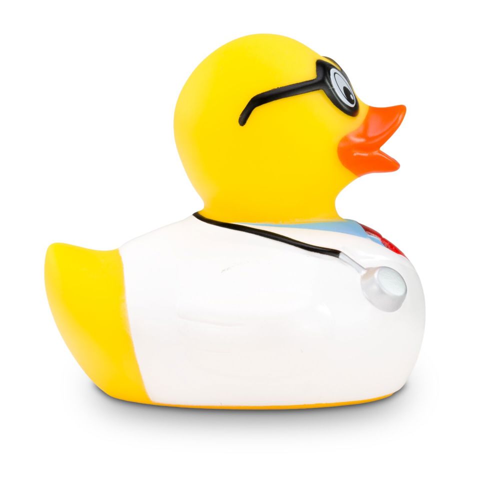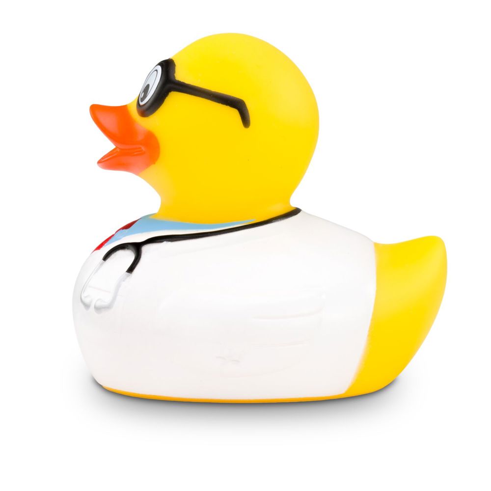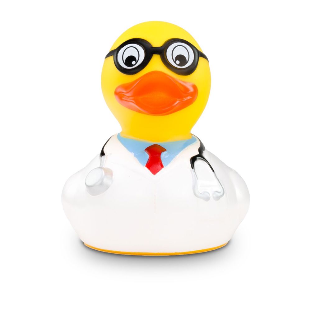 Die kultige Arzt-Quietscheente für die Badewanne. Dr. Dagobert trägt stilecht einen weißen Arztkittel, eine rote Krawatte, ein hellblaues Hemd und eine schwarze Brille. Das Stethoskop hängt einsatzbereit für die nächste Untersuchung um den Hals. Dr. Dagobert kümmert sich gemeinsam mit Medizinstudenten um die Pflege seiner Patienten und sorgt für gute Laune unter den Kollegen im Krankenhaus. Ab und zu praktiziert er auch noch in seiner eigenen Enten-Praxis. Größe: ca. 8 cm. Inklusive Quietschventil