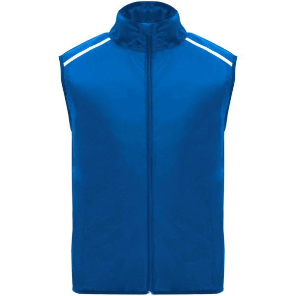 Leichte Funktions - Laufweste, winddicht und atmungsaktiv. Frontreißverschluss mit passendem Kinnschutz. Elastische Einfassung am Armausschnitt und Saum. Untere Rückenpartie aus mikroperforiertem Stoff. Reflektierende Details auf den Schultern, Front- und Rückseite. Tasche mit elastischem Band zum Verstauen der Weste und zum Tragen am Handgelenk. Abnehmbares Etikett.