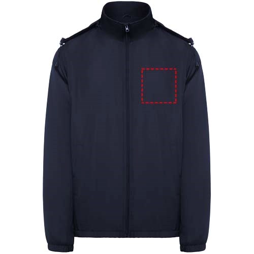 Leichte, wasserabweisende Jacke. Hoher Kragen und einrollbare, verstellbare Kapuze. Innenfutter aus Microfleece. Front-Reißverschluss und Kinnschutz. Elastische Ärmelbündchen. Zwei Seitentaschen mit Reißverschluss. Innere Brusttasche links. Herausnehmbares Etikett. Wasserabweisend. Winddicht. Das männliche Modell ist 184 cm groß und trägt Größe L, das weibliche Modell ist 174 cm groß und trägt Größe S.