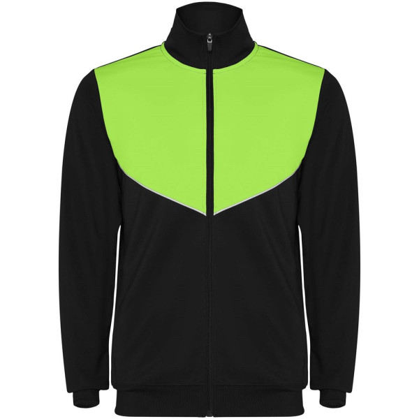 Trainingsanzug aus leichtem und elastischem Stoff. Jacke mit farblich abgesetzten Nähten im Brustbereich. Hoher Kragen mit Kontrastnähten. Zentraler Frontreißverschluss. Seitentaschen. 2x2-Rippenbündchen an Ärmeln und Bund. Hose mit elastischem Bund und Kordelzug. Seitliche Kontrasteinsätze mit Steppnaht. Beinsaum mit Reißverschluss.