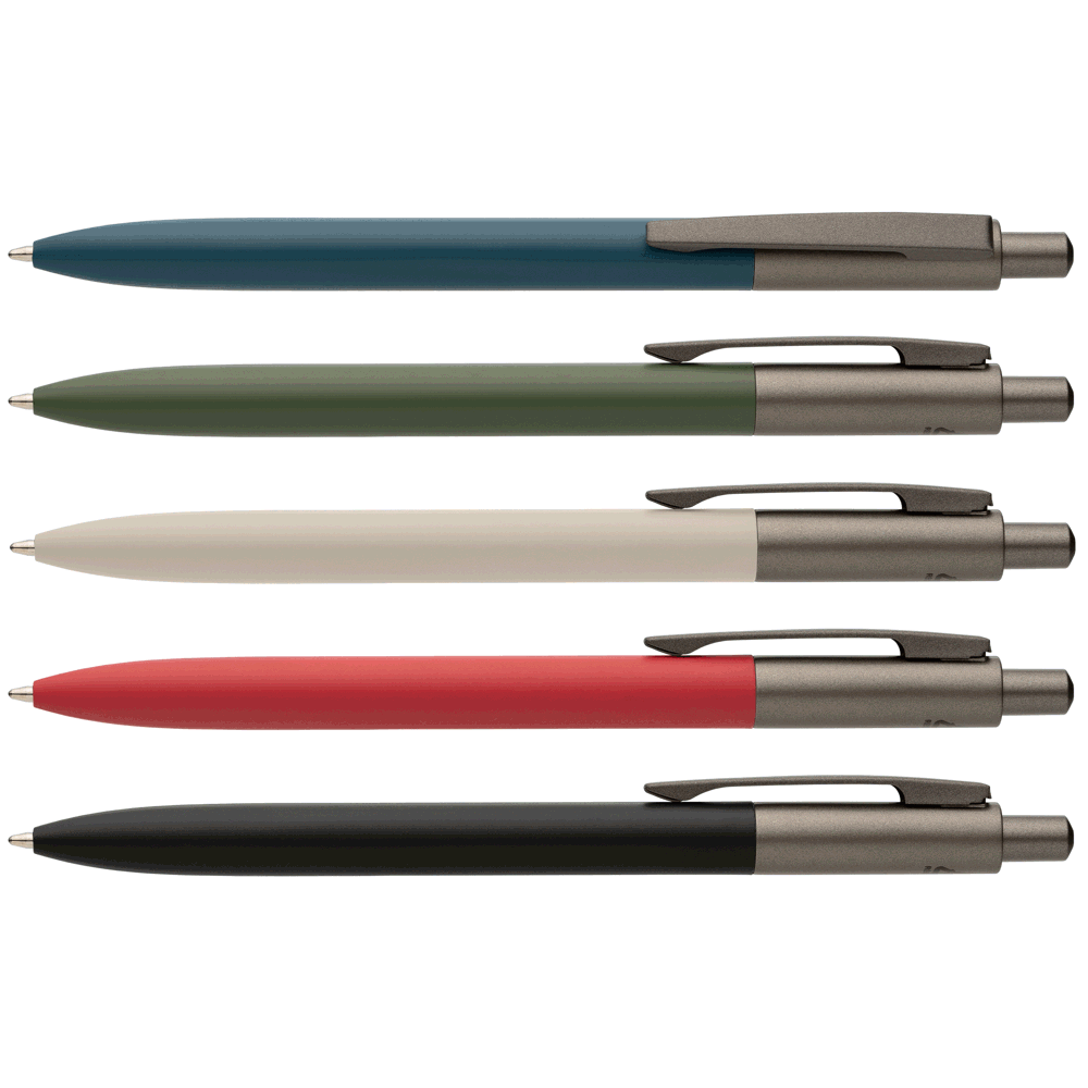 **Demnächst verfügbar – Ende März** Der Koro ist ein Klick-Metallkugelschreiber, der durch sein klassisches Design einen hochwertigen, repräsentativen Eindruck vermittelt. Dieser elegante Kugelschreiber verfügt über einen unteren Schaft, der aus 100 % recyceltem Aluminium hergestellt und mit einer glatten, matten Lackierung versehen ist. Dies steht in wunderschönem Kontrast zum oberen Gehäuse (aus 100 % recyceltem ABS) und dem Drücker, beide in elegantem Gunmetal-Finish. Der Stahlclip verfügt ebenfalls über eine Gunmetal-Oberfläche, die das elegante, zweifarbige Erscheinungsbild abrundet. Ausgestattet mit einer schlanken X20-Mine mit flüssiger schwarzer Tinte bietet der Koro eine konstante Schreiblänge von 500 Metern durch eine 1,0 mm Spitze. Dieser Kugelschreiber ist in eleganten Farben wie Marineblau, Waldgrün und Terrakottarot erhältlich und stellt eine zuverlässige und elegante Wahl für Fachleute dar.