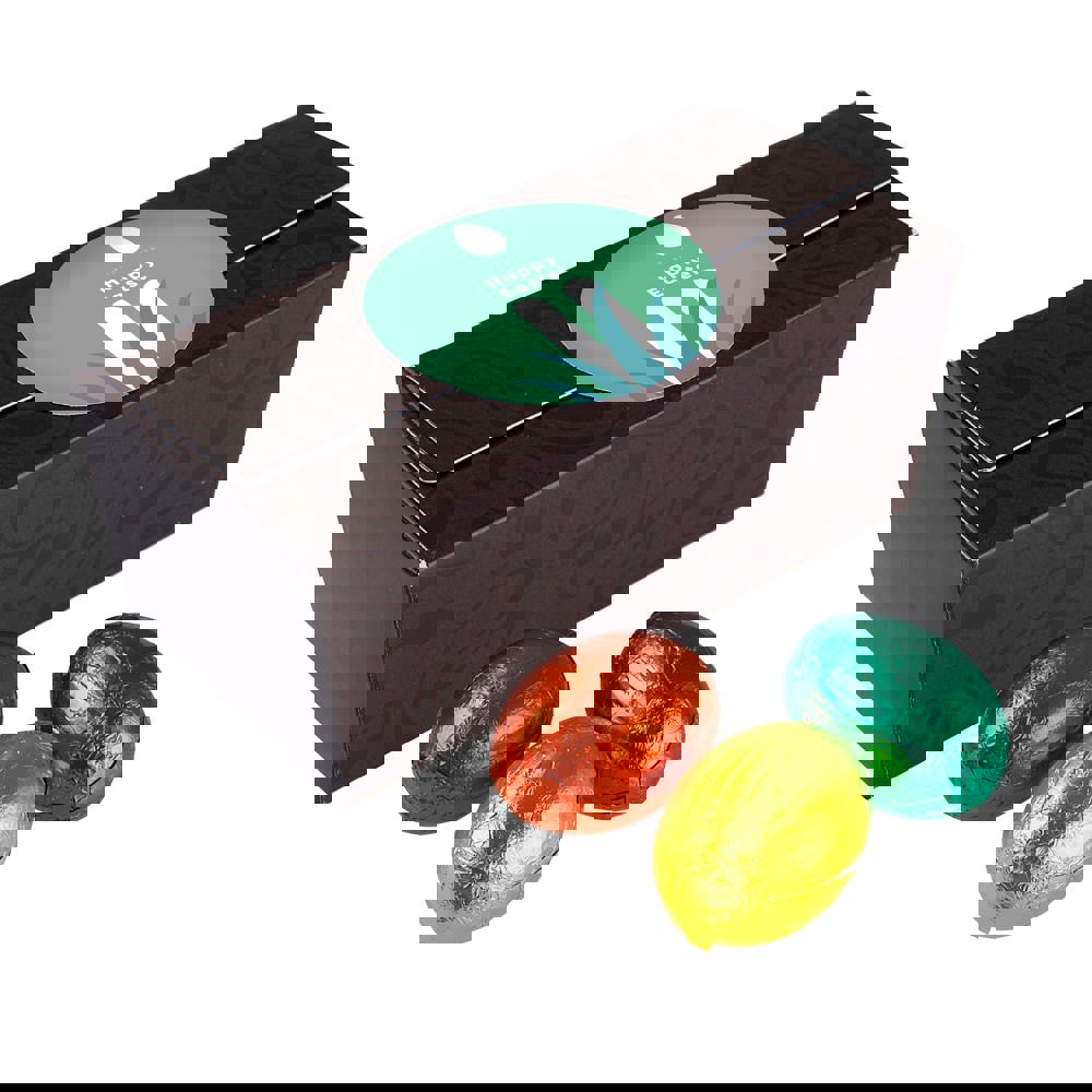 Standard bedruckte Ballotin-Schachtel mit einem vollfarbigen Aufkleber auf dem Deckel und gefüllt mit ca. 150 Gramm knusprigen Ostereiern