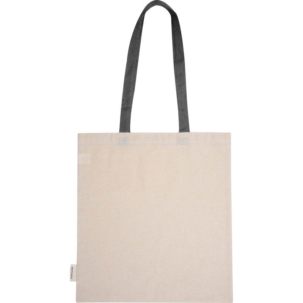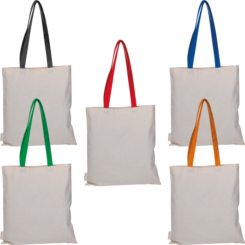 Baumwolltasche mit zwei langen Henkel aus 75% recycelter Baumwolle und 25% recyceltem PET. Grammatur 140 gsm. Ihre Werbung bringen wir auf einer Seite der Tasche an.