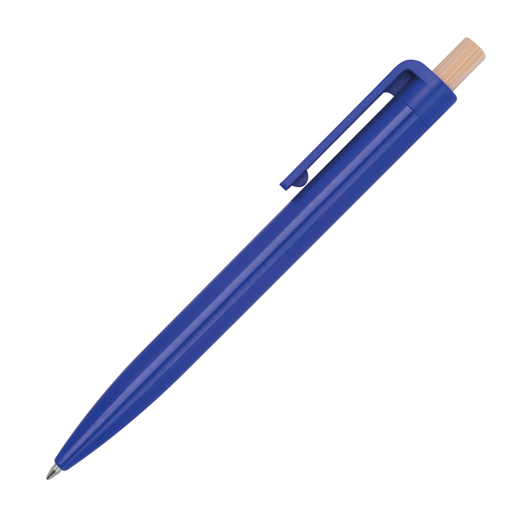 Kugelschreiber aus recyceltem ABS und einem Drücker aus Bambus. Er verfügt über eine blauschreibende Kunststoffmine. Ihre Werbung drucken wir unterhalb vom Clip aus den Schaft.