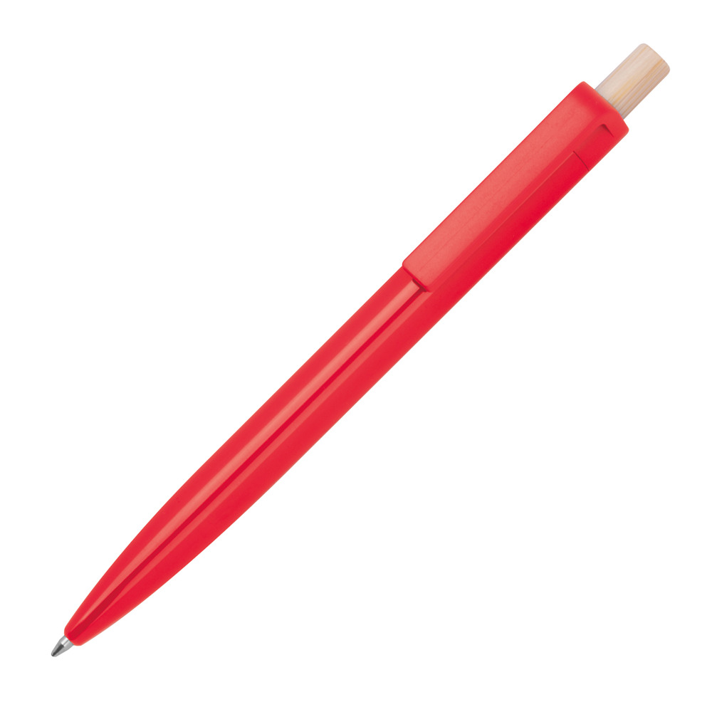 Kugelschreiber aus recyceltem ABS und einem Drücker aus Bambus. Er verfügt über eine blauschreibende Kunststoffmine. Ihre Werbung drucken wir unterhalb vom Clip aus den Schaft.