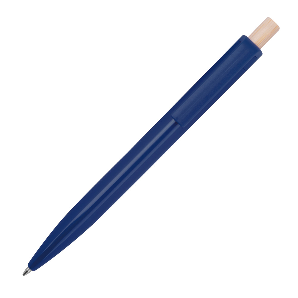 Kugelschreiber aus recyceltem ABS und einem Drücker aus Bambus. Er verfügt über eine blauschreibende Kunststoffmine. Ihre Werbung drucken wir unterhalb vom Clip aus den Schaft.