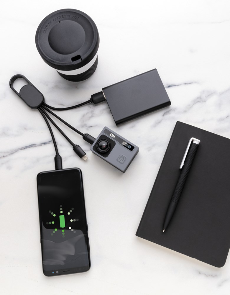 Dieses 4-in-1 Ladekabel mit Karabiner hat einen USB-Input, einen doppelseitigen Output für iOS und Mircro-USB für Android-Geräte sowie einen Type-C-Output um so alle gängingen Geräte laden zu können. Das Case aus ABS und das 10cm Kabel mit Nylon umwoben. Unterstützt das Laden bis zu 2.1A.