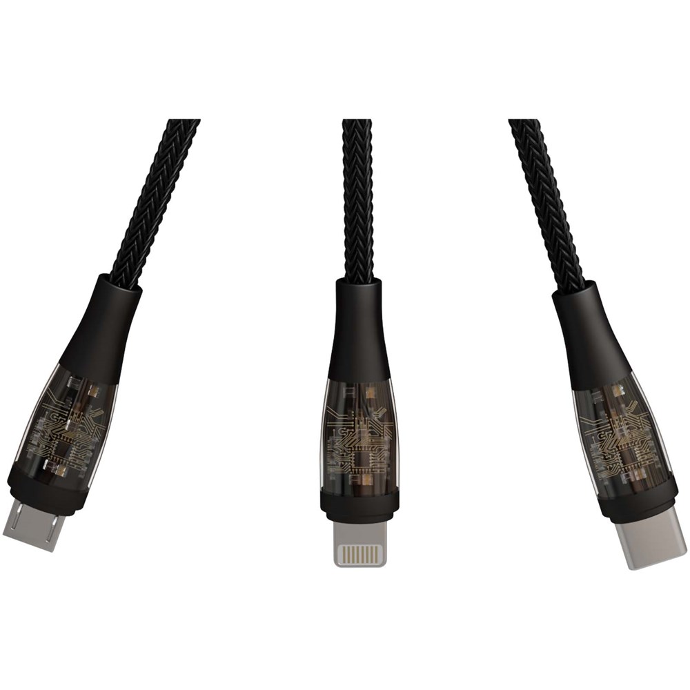 5-in-1-Schnelllade- und Datenübertragungskabel. Input: USB-A/USB-C. Ausgang: Micro-USB/Type-C/Blitz. Schnellladen: 100 W/5 A. Transparente Stecker. Digitales Display mit Übertragungsgeschwindigkeit auf der Vorderseite und beleuchtetes Logo auf der Rückseite.