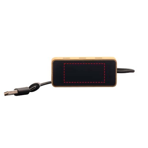 8-in-1 USB-Hub aus nachhaltigeremm Bambus und rPET, der mit 3 USB-A- und 3 USB-C-Anschlüssen bis zu 6 Geräte gleichzeitig verbinden kann. Er ist voll kompatibel mit modernen Computern, verfügt über ein personalisierbares LED-Logo und wird in einer Geschenkbox aus recyceltem Karton geliefert, die Funktionalität mit tollem Design vereint. Übertragungsgeschwindigkeit: USB/480 Mbit/s. Größe 8 × 3,5 × 1,5 cm. Kabellänge: 24 cm.