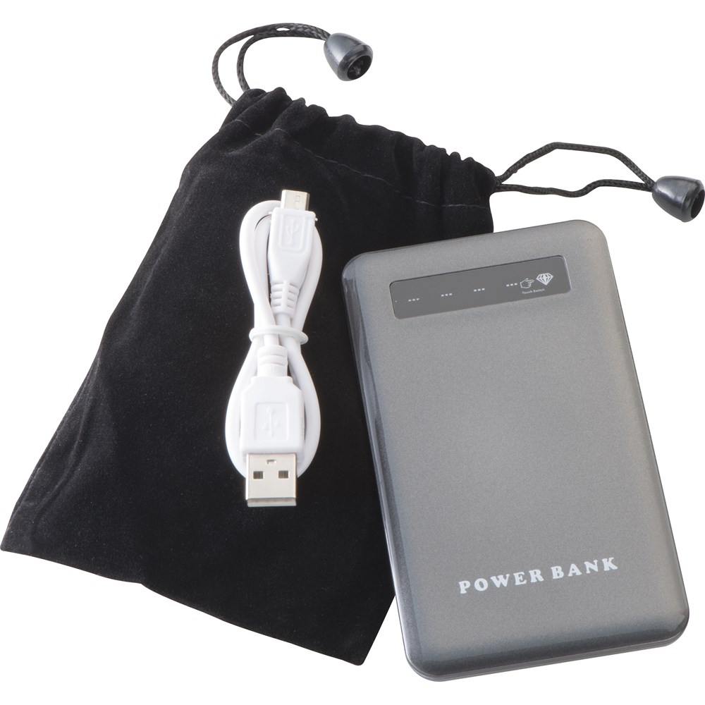 Die Powerbank mit Ladestandsanzeige und Veloursetui verfügt über eine Kapazität von 4.000 mAh und eignet sich perfekt für alle gängigen Smartphones und Tablets. Inklusive USB-Ladekabel. Ihre Werbung drucken wir auf die Vorderseite der Powerbank.