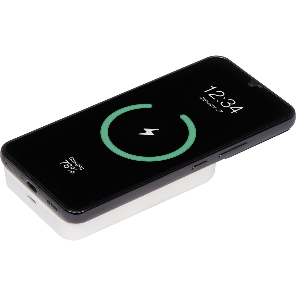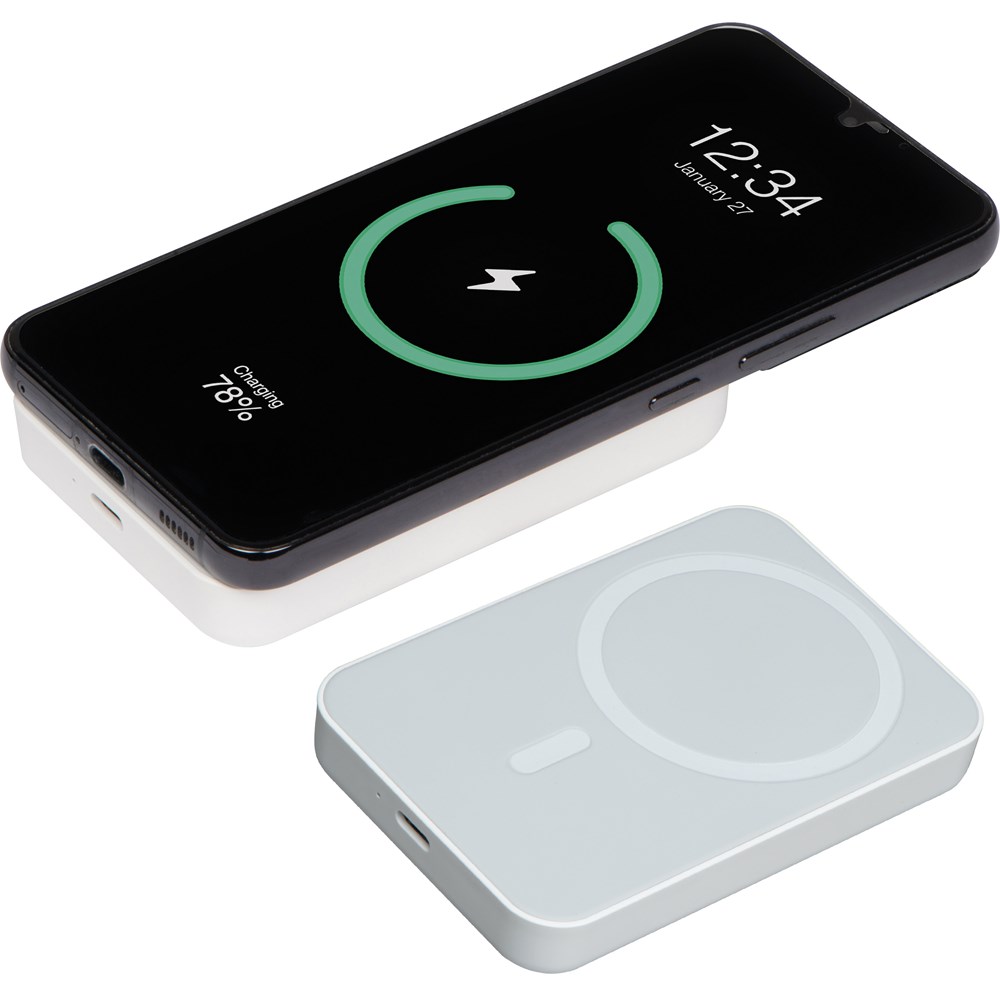 MagSafe Powerbank aus Kunststoff mit 5.000 mAh Kapazität und rubber finish Oberfläche für eine besonders angenehme Haptik. Mit USB-C-Anschluss zum Aufladen (Input und Ouput angeschlossen 10W, Output kabellos 5W). Kompatible Geräte ab dem Iphone 12, Android-Geräte mit Magsafe Ladefunktion. Ihre Werbung gravieren wir auf die Vorderseite der Powerbank im unteren Drittel.