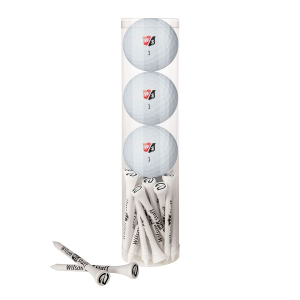 Transparente Röhre mit 20 Wilson-Tees aus Bambusholz 70 mm mit Bedruckung auf dem Cup und 3 WilsonPX3 Soft Golfbälle mit 1-seitige Druck