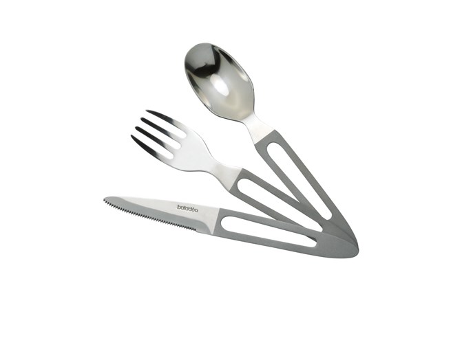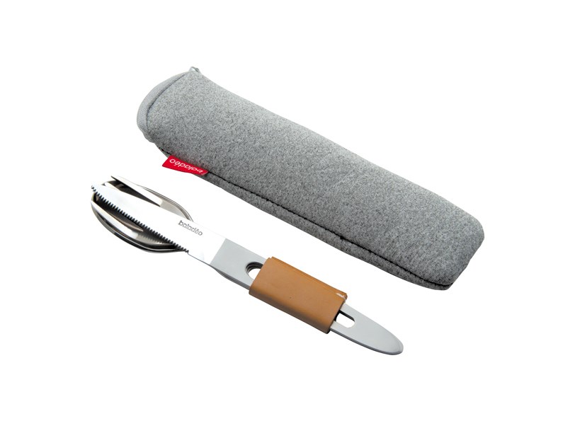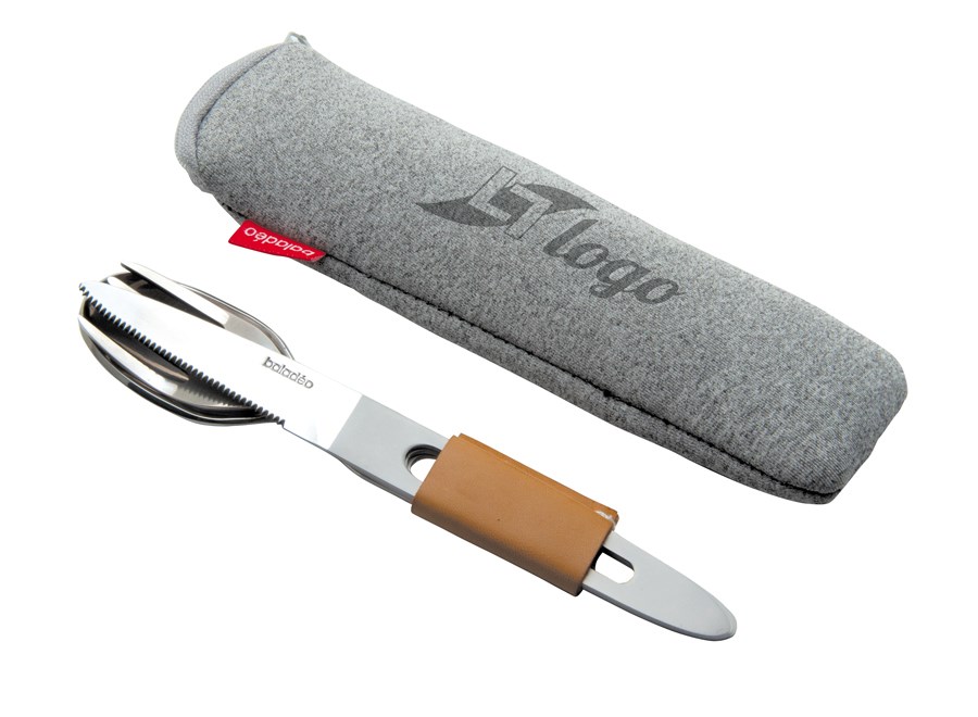Besteckset aus 420er Edelstahl für den Lebensmittelgebrauch. 3 Funktionen: Messer mit Mikrozahnung, Gabel, Löffel. Spülmaschinenfestigkeit. Manschette aus Kunstleder. Wird in einem Neoprenetui geliefert.