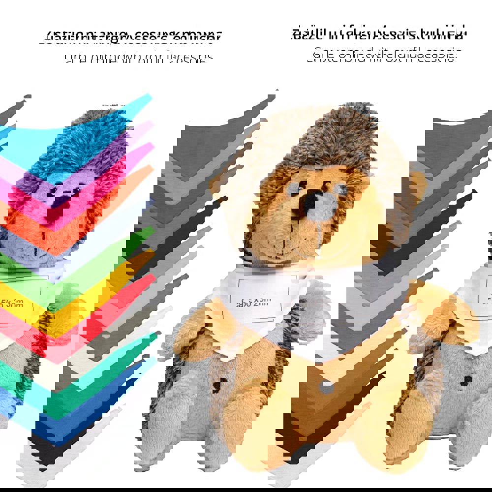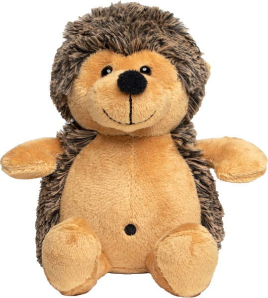 Unser Carsten rollt sich nicht zusammen, denn er hat keine Angst vor Kuscheleinheiten. Eigentlich haben Igel ja nur am Bauch und Gesicht Haare, rund um die immer feuchte Nase (die bei Carsten äußerst prägnant ist), um die dunklen Knopfaugen und um die Ohren herum, der Rest ist stachelig. Aber seine Stacheln tun natürlich nur so als ob: Langer Plüsch in zwei Farben sorgt durch die Melierung für den „Stachel-Look“.