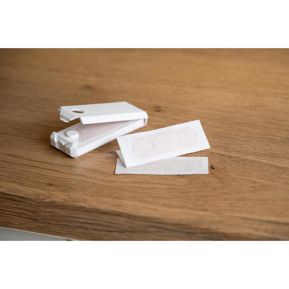 Mit einer Hand zu öffnen aufgrund des Druckknopf-Klickverschlusses. Kunststoffbox befüllt mit 5 x 2-er Pflastern. Farbkombinationen, Fußball-Design und geprägtes Logo im Verschlussknopf auf Anfrage.