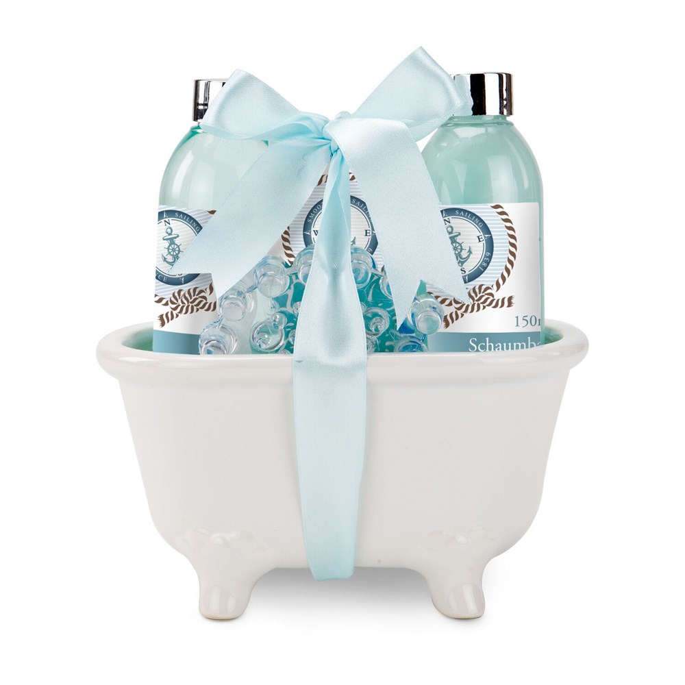 Eine Wanne voller Entspannung bietet dieses Set. 150 ml Duschgel, 150 ml Schaumbad, 200 g Badesalz sowie eine Massagebürste aus Kunststoff sind stilvoll verpackt in einer weißen Keramik-Badewanne. Duft Ocean.