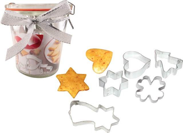 Elegant und absolut praktisch: das Weckglas zum Verschließen mit 5 verschiedenen Ausstechformen (Baum, Herz, Stern, Komet, Kleeblatt) für die Weihnachtsbäckerei. So können die Ausstechformen geschützt aufbewahrt werden. Platz für den Werbedruck ist auf dem Standardmotiv des Einlegers oder eine eigene estaltung, jeweils ab 100 Stück.