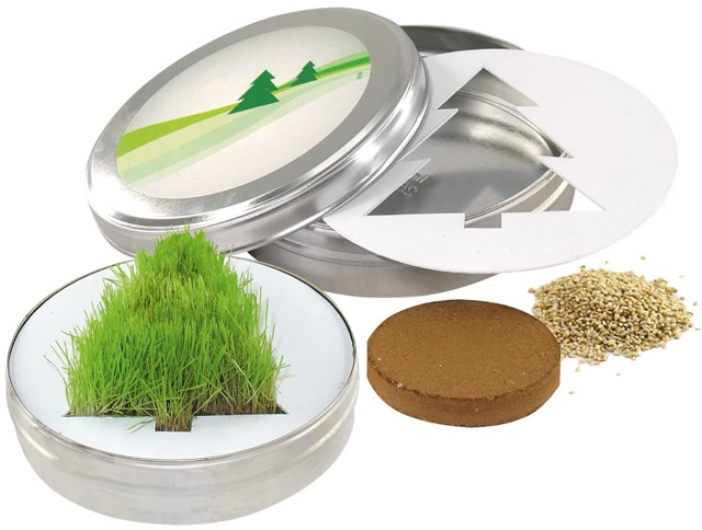 Der etwas andere Tannenbaum zu Weihnachten. Dieser wächst mit Hilfe einer Tannenbaum-Schablone aus Gras-Samen. Einfach den Samen in die gestanzten Aussparungen der Schablone einsäen, vorsichtig wässern und bald entsteht der Tannenbaum. Den Rasenschnitt der Gras-Pflanzen bald vornehmen, damit die Konturen gut sichtbar bleiben. Alles ist für die Anzucht praktisch in einer Metalldose verpackt. Ein eigenes Logo der Wachstumsschablone ist ab 1.000 Stück möglich. Der Deckelaufkleber bietet Platz für Ihren Werbeeindruck oder eine eigene Gestaltung, jeweils ab 250 Stück. Ein Tampondruck direkt auf der Wachstumsschablone ist möglich. Inhalt: Tannenbaum-Schablone, Erdtablette, Samen: Gras