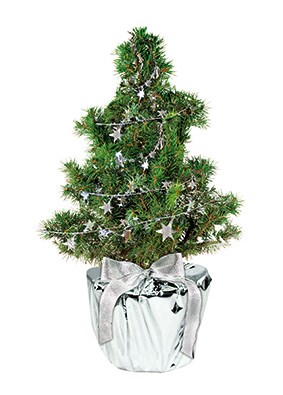 Inhalt: Bäumchen 20-30 cm geschmückt mit silbernem Sternchendraht, Topffolie silber, Schleife silber