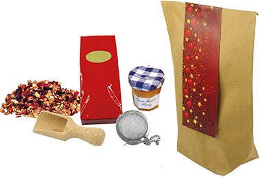 Unsere neue Geschenktüte enthält alles für die Zubereitung eines wohlschmeckenden Tees: ca. 50 g Weihnachts-Früchtetee, Tee-Ball und 50 g Honig sowie eine kleine Holzschaufel (7 cm) zum Entnehmen des Tees. Ein Klassiker für den Tee-Liebhaber. Der Werbedruck erfolgt auf dem Standardmotiv der Karte oder eine eigene Gestaltung, jeweils ab 100 Stück. Inhalt: ca. 50 g Weihnachts-Früchtetee, Teeball, 50 g Honig, kleine Holzschaufel 7 cm Warn- und Sicherheitshinweise: Kinder nicht unbeaufsichtigt am heißen Herd oder mit kochendem Wasser hantieren lassen!