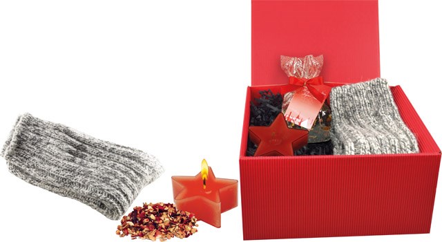 Dieser rote Präsent-Karton beinhaltet alles für einen gemütlichen Wintertag: ein paar warme, mollige Socken, eine rote Stern-Kerze sowie ca. 50 g Weihnachts-Früchtetee. So kann man es sich auf der Couch gut gehen lassen. Platz für den Werbedruck ist auf dem Standardmotiv des Anhänge-Kärtchens oder eine eigene Gestaltung des Kärtchens, jeweils bereits ab 100 Stück. Inhalt: 1 Paar Mollig Socks, ca. 50 g Weihnachts-Früchtetee, 1 Sternlicht Warn- und Sicherheitshinweise: Kerze nicht unbeaufsichtigt brennen lassen und auf eine feuerfeste Unterlage stellen. Kinder nicht unbeaufsichtigt am heißen Herd oder mit kochendem Wasser hantieren lassen!