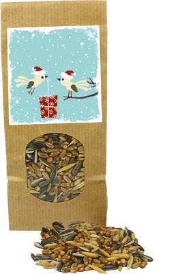 Ein Werbegeschenk für jeden Vogel-Liebhaber. Die Tüte enthält ca. 150 g Wildvogel-Futter, welches die Vögel in der kalten Jahreszeit dankend annehmen und bei Schnee und Eis dringend benötigen. Es ist immer wieder schön, die Vögel in der Winterzeit zu beobachten. Platz für den Werbedruck ist auf dem Standardmotiv des Etiketts oder eine eigene Gestaltung des Etiketts, jeweils bereits ab 250 Stück.