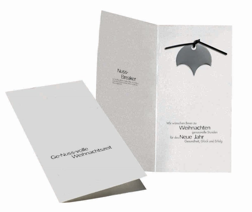 Diese edle Weihnachtskarte enthält einen Edelstahl-Nussbreaker, der in der Winterzeit immer wieder zum Einsatz kommt (ohne Nuss). Platz für den Werbedruck ist auf dem Standardmotiv der Karte oder eine eigene Gestaltung, jeweils ab 100 Stück. Ein Kuvert ist separat erhältlich Art. 6101.