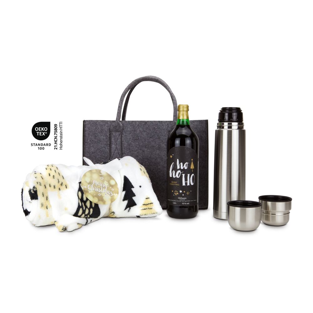 Gemütliche Winterabende in einer praktischen Filztasche verpackt. Hier erhalten Sie eine Flasche Glühwein (1 l), eine passende ROMINOX® Isolierkanne (750 ml) mit clever integriertem Zweitbecher im Deckel sowie die Kuscheldecke Merry Christmas (120 x 150 cm, STANDARD 100 von OEKO-TEX®). Die Decke wird schnell zum kuscheligen Begleiter für die kalte Jahreszeit, während Sie die Tasche aus veganem Filz aus 100% recyceltem PET (zertifiziert nach Global Recycling Standard; ca. 36 x 20 x 25 cm) als praktischen Begleiter das ganze Jahr über nutzen können.