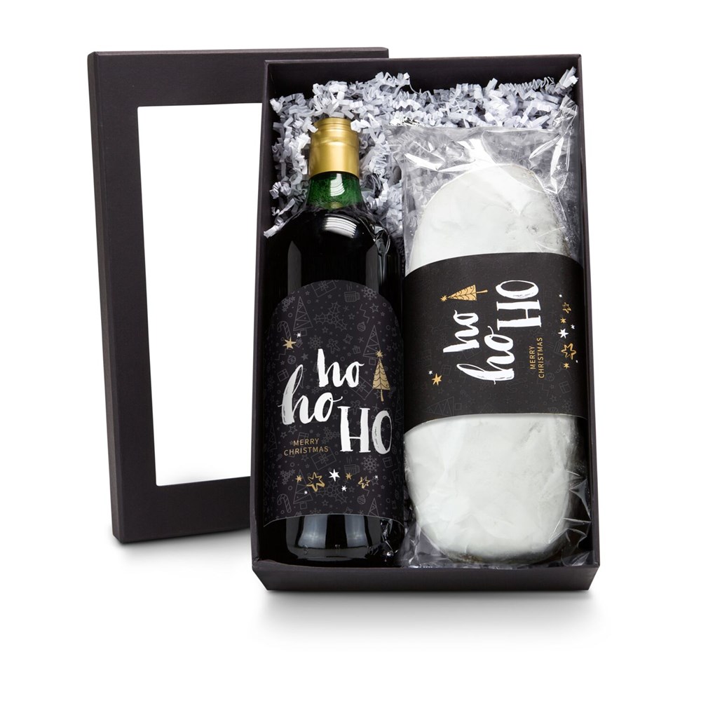 Die perfekte Kombination zur Weihnachtszeit: ein Glühpunsch (1 l, alkoholfrei) und ein leckerer Christstollen (750 g). Das Gebäck ist mit Rosinen und kandierten Früchten verfeinert und von einer festlichen Banderole umhüllt. Beides liegt auf schneeweißem Sizzle. Der schwarze Karton mit Sichtfenster rundet die weihnachtliche Kombination ab. Da kommt direkt Vorfreude auf.