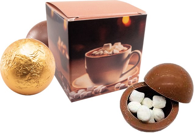 Ein ganz besonderes Geschmackserlebnis entfaltet die mit Marshmallows gefüllte Schoko-Kugel, sobald sie in heißer Milch aufgelöst ist. Ein köstlicher Genuss in der kalten Jahreszeit. Ihre Werbebotschaft oder eine eigene Gestaltung der Würfelpackung ist bereits ab 250 Stück möglich. Inhalt: Schoko-Kugel, Marshmallowfüllung (21 g) Warn- und Sicherheitshinweise: Kinder nicht unbeaufsichtigt am heißen Herd oder mit kochendem Wasser hantieren lassen!