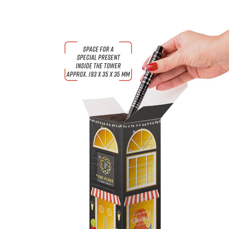 Adventskalenderturm mit kompostierbarem Inlay, rundum individuell bedruckt. mit 5 Werbeflächen.... mehr