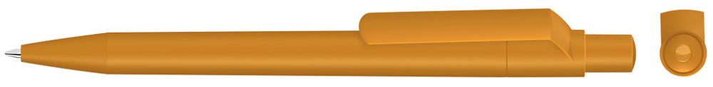 Druckkugelschreiber mit gedeckt mattem Gehäuse, Clip, Drücker und Stopfen.
