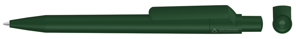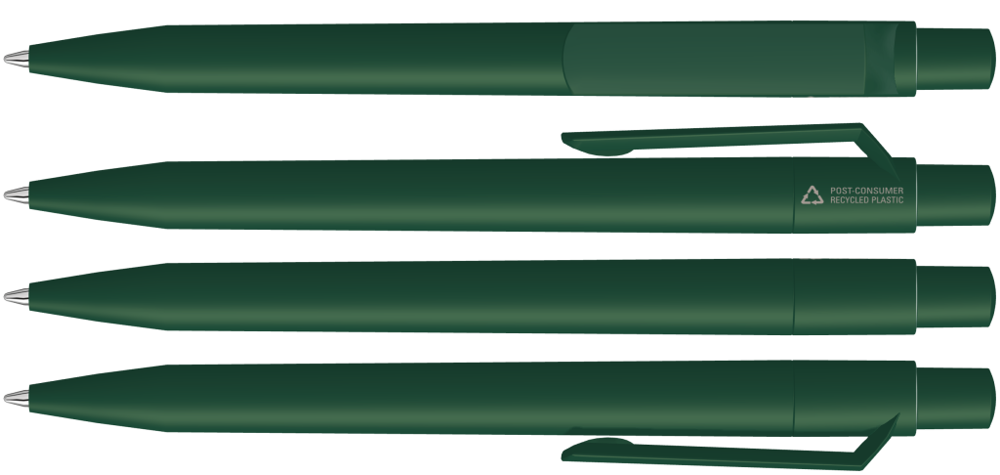 Druckkugelschreiber mit gedeckt mattem Gehäuse, Clip, Drücker und Stopfen aus 100% recyceltem Post-Consumer-Kunststoff.
