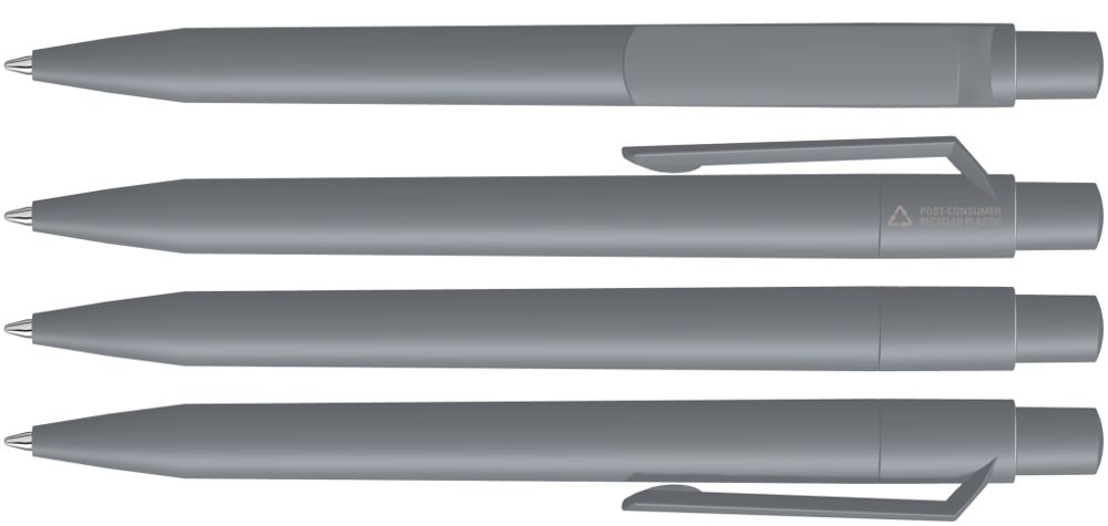 Druckkugelschreiber mit gedeckt mattem Gehäuse, Clip, Drücker und Stopfen aus 100% recyceltem Post-Consumer-Kunststoff.