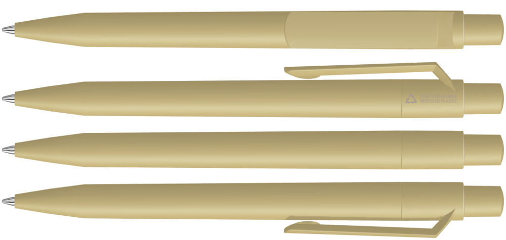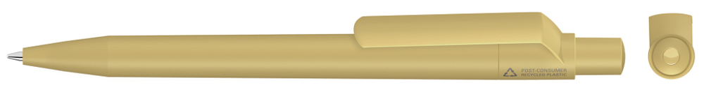 Druckkugelschreiber mit gedeckt mattem Gehäuse, Clip, Drücker und Stopfen aus 100% recyceltem Post-Consumer-Kunststoff.