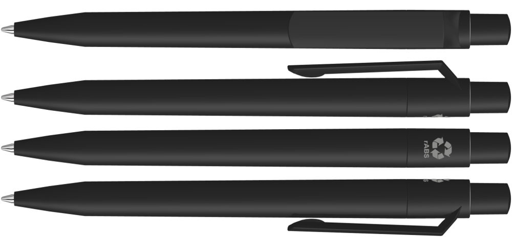 Druckkugelschreiber mit gedeckt mattem Gehäuse, Clip, Drücker und Stopfen aus recyceltem ABS-Kunststoff.