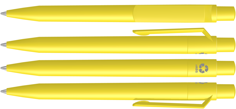 Druckkugelschreiber mit gedeckt mattem Gehäuse, Clip, Drücker und Stopfen aus recyceltem ABS-Kunststoff.