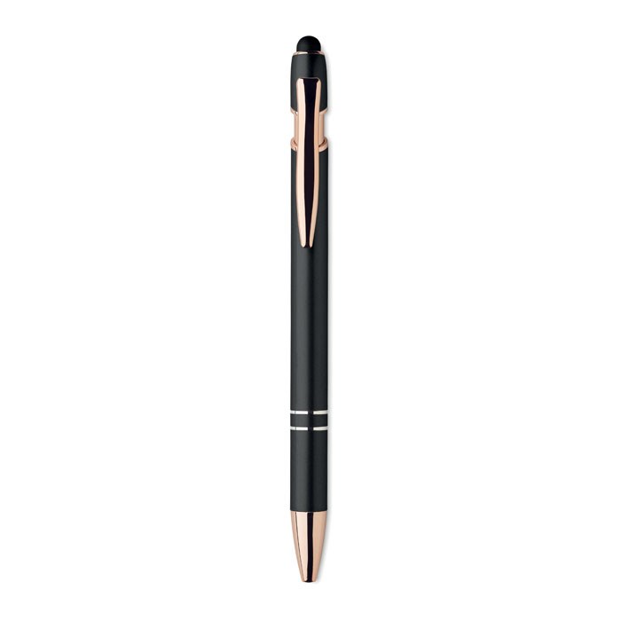 Druckkugelschreiber mit Stylus aus recyceltem Aluminium mit rosé goldenen Details. Blaue Tinte.