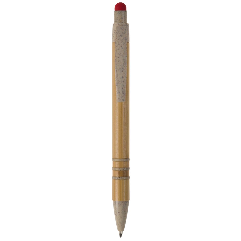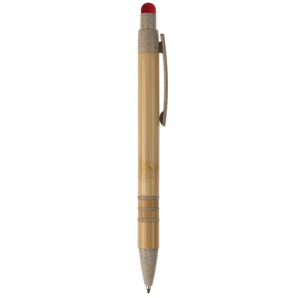 Kugelschreiber mit Bambusschaft. Spitze, Clip, Drücker und Schaftringe bestehen aus Weizenstroh. Auf dem Drücker befindet sich ein farbiger Stylus zur Smartphone-Nutzung. Ein vielseitiger Werbeartikel, ausgestattet mit einer blau schreibenden Jumbo-Mine.