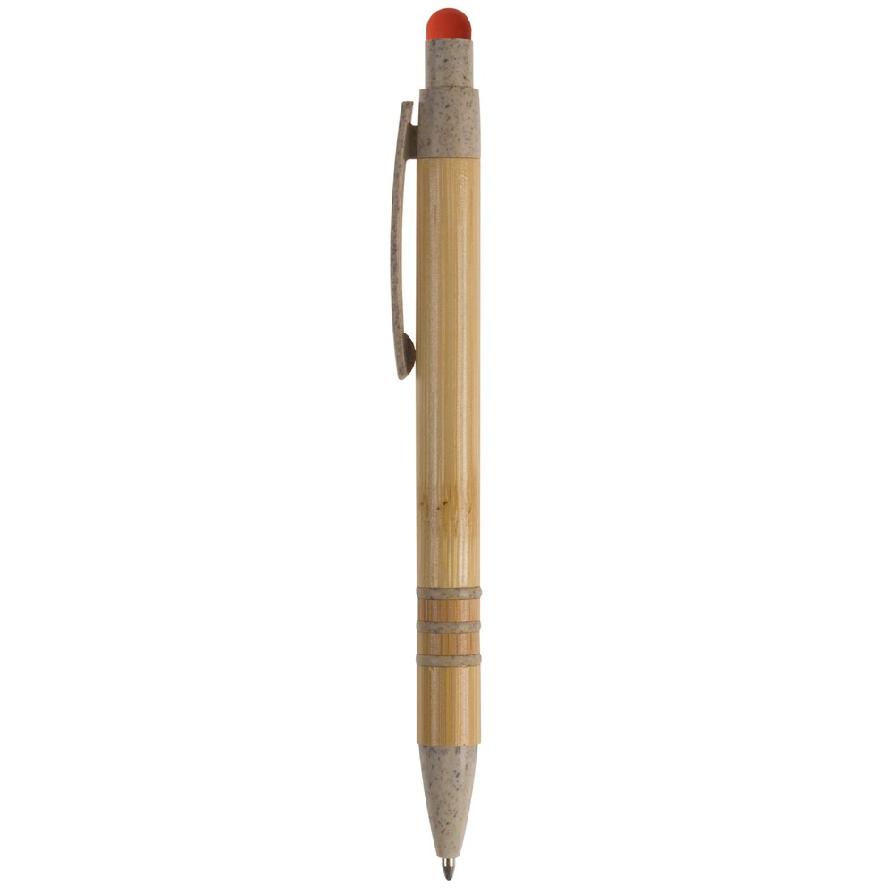 Kugelschreiber mit Bambusschaft. Spitze, Clip, Drücker und Schaftringe bestehen aus Weizenstroh. Auf dem Drücker befindet sich ein farbiger Stylus zur Smartphone-Nutzung. Ein vielseitiger Werbeartikel, ausgestattet mit einer blau schreibenden Jumbo-Mine.