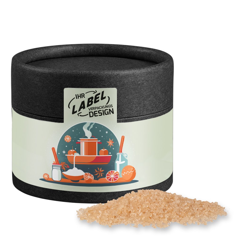 Kraftpapierdose Mini schwarz aus Papier. Werbeanbringung als Etikett in 4c individuell bedruckbar.