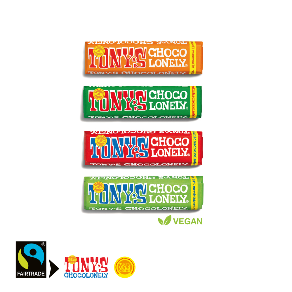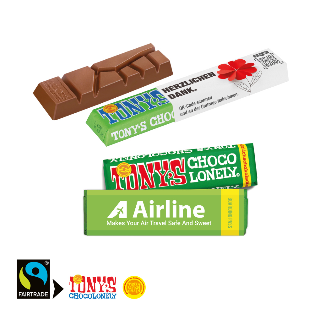 Macht die Welt ein bisschen fairer! Die faire und himmlisch leckere Tony´s Schokolade ist auch als Riegel erhältlich. Ideal als Snack für zwischendurch oder für unterwegs. Produktdetails: Tony´s Schokolade verpackt in einem individuellen Werbeschuber. Nachhaltigkeit: Für jede Bestellung mit uns wird ein Baum über GROW MY TREE gepflanzt. Wir verwenden FSC® zertifizierten Karton aus nachhaltiger Forstwirtschaft und anderen kontrollierten Quellen.