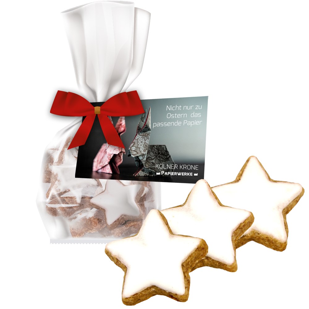 Zimtsterne, ca. 50g, Express Standbeutel Mini mit Schleife mit Werbekarte