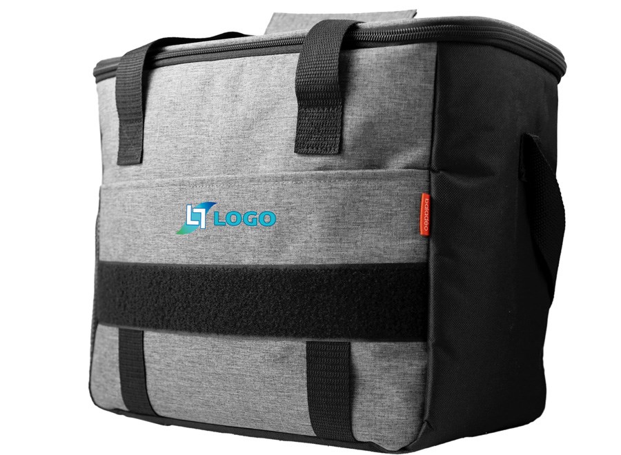 Thermokühlbox aus grau meliertem Wulongstoff. Isolierende 5mm dicke Ausführung. Vordertasche und Aufbewahrungsnetz auf einer Seite. Griffe und verstellbarer Tragegurt vorhanden. Reißverschluss mit Flaschenöffner aus Aluminium. Fassungsvermögen: 15 L.