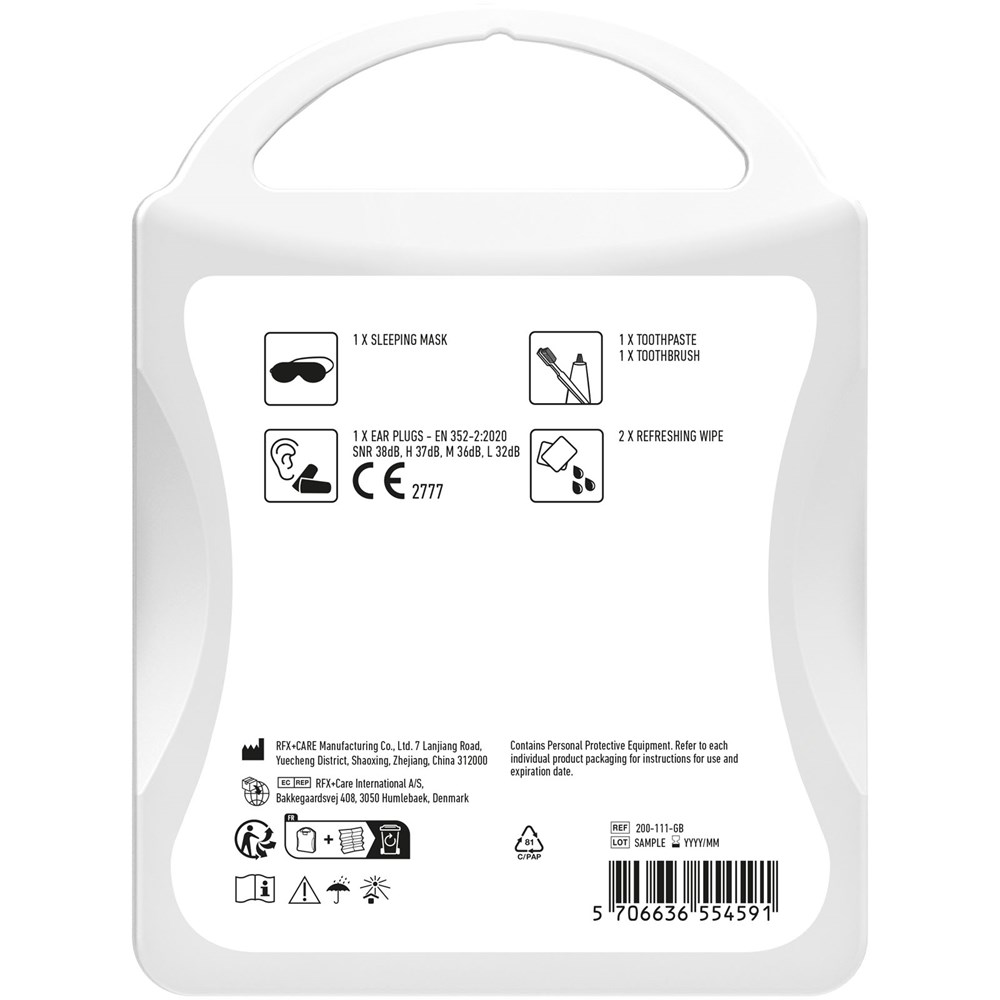 Ideales Reiseset für jede Reise. Mit diesem Set können Sie sich entspannen und erfrischen, sodass Sie ausgeruht an Ihrem Ankunftsort ankommen. Inhalt: 1 Augenmaske, 2 Ohrstöpsel, 2 Reinigungstücher. Alle im Set enthaltenen Erste-Hilfe- und Pflegeprodukte erfüllen alle geltenden EU-Vorschriften. Preis inkl. vollfarbigem Druck.