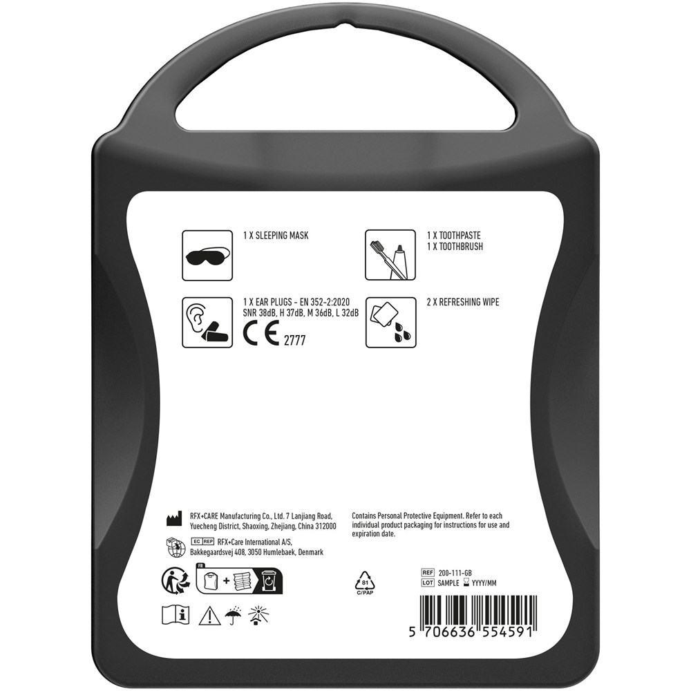 Ideales Reiseset für jede Reise. Mit diesem Set können Sie sich entspannen und erfrischen, sodass Sie ausgeruht an Ihrem Ankunftsort ankommen. Inhalt: 1 Augenmaske, 2 Ohrstöpsel, 2 Reinigungstücher. Alle im Set enthaltenen Erste-Hilfe- und Pflegeprodukte erfüllen alle geltenden EU-Vorschriften. Preis inkl. vollfarbigem Druck.