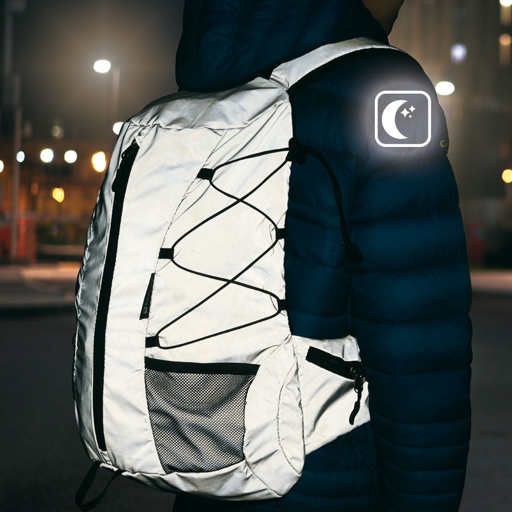 Reflektierender Rucksack für ausgezeichnete Sichtbarkeit. Bei normalem Tageslicht erscheint er grau, trifft Licht auf die Oberfläche, wird der Rucksack durch die starke Reflexion unübersehbar. Das Material erfüllt die Anforderungen der Norm EN ISO 20471 für Warnschutzkleidung. Der Rucksack hat einen gepolsterten Rücken und Schultergurte, ein Hauptfach mit Frontzugang und eine weitere kleine Reißverschlusstasche. Dazu noch eine Netztasche an der Seite, im Hüftgurt befinden sich zwei kleinere Reißverschlusstaschen. Volumen: 20 l Gewicht: 355 g Material: 100% Polyester mit Reflexions-Beschichtung Empfohlene Veredelungstechnik: Siebdruck S3 Maximale Veredelungsgröße: 70 × 40 mm Abmessungen: 28 × 14 × 45 cm