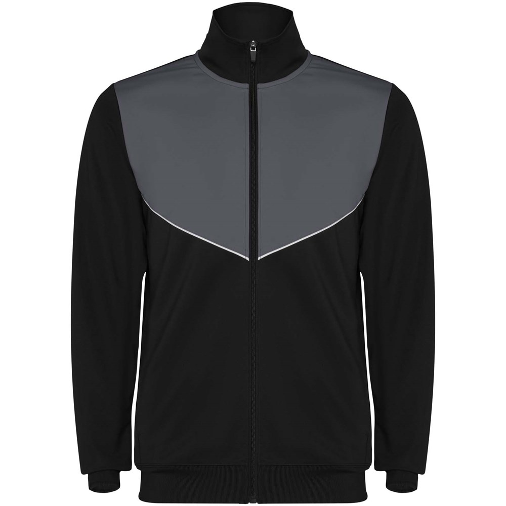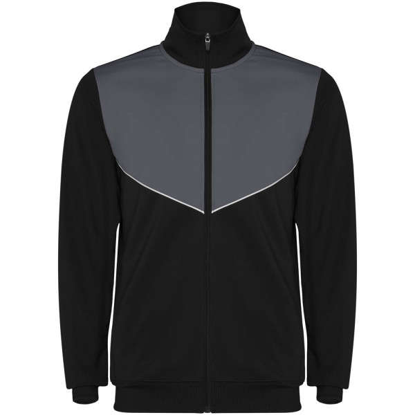 Trainingsanzug aus leichtem und elastischem Stoff. Jacke mit farblich abgesetzten Nähten im Brustbereich. Hoher Kragen mit Kontrastnähten. Zentraler Frontreißverschluss. Seitentaschen. 2x2-Rippenbündchen an Ärmeln und Bund. Hose mit elastischem Bund und Kordelzug. Seitliche Kontrasteinsätze mit Steppnaht. Beinsaum mit Reißverschluss.