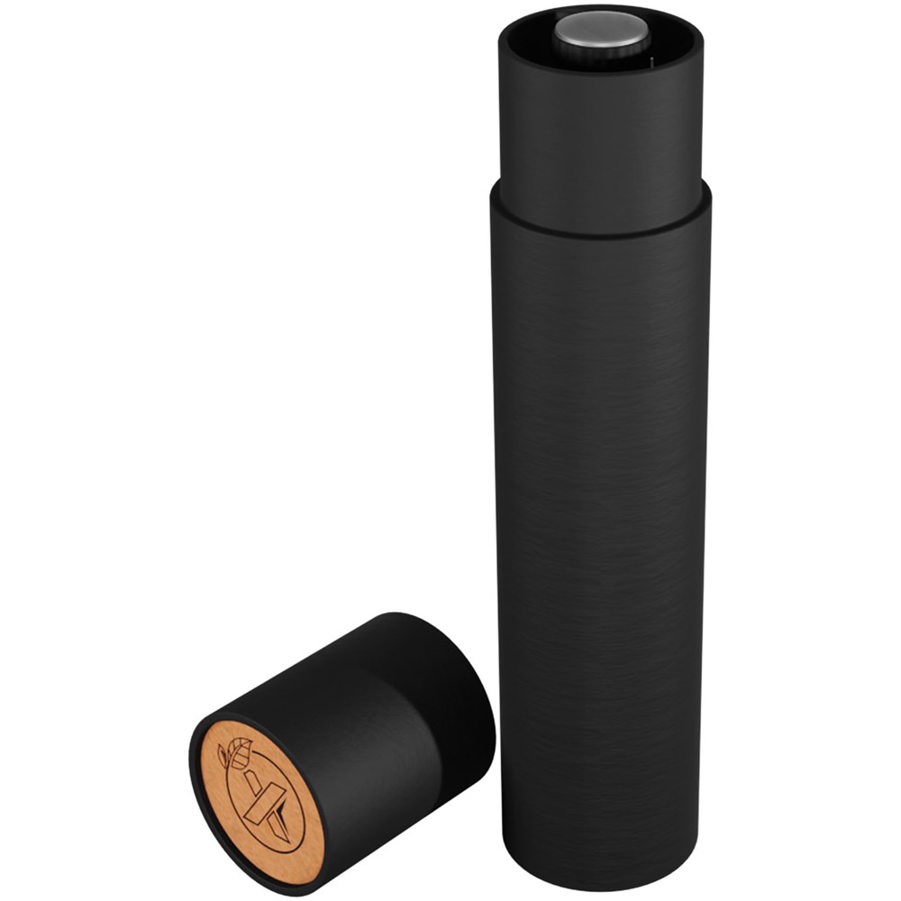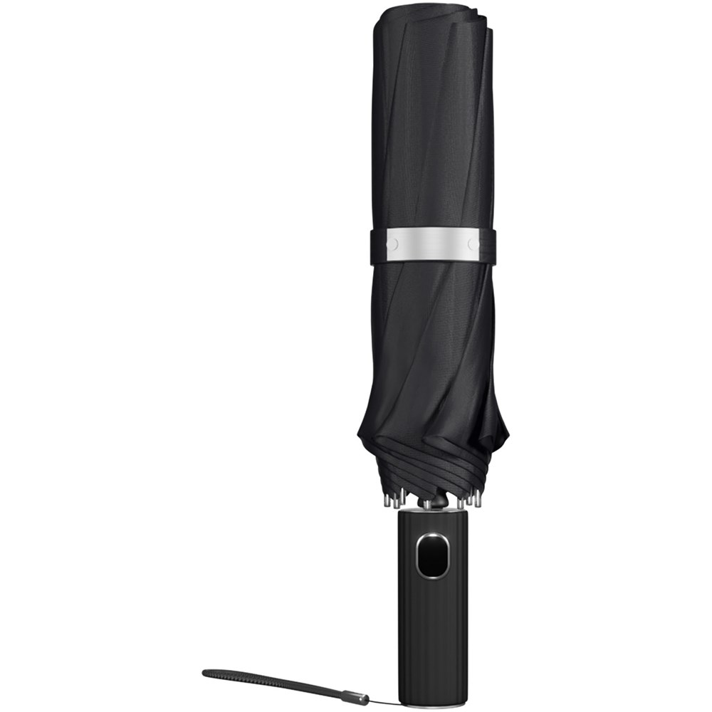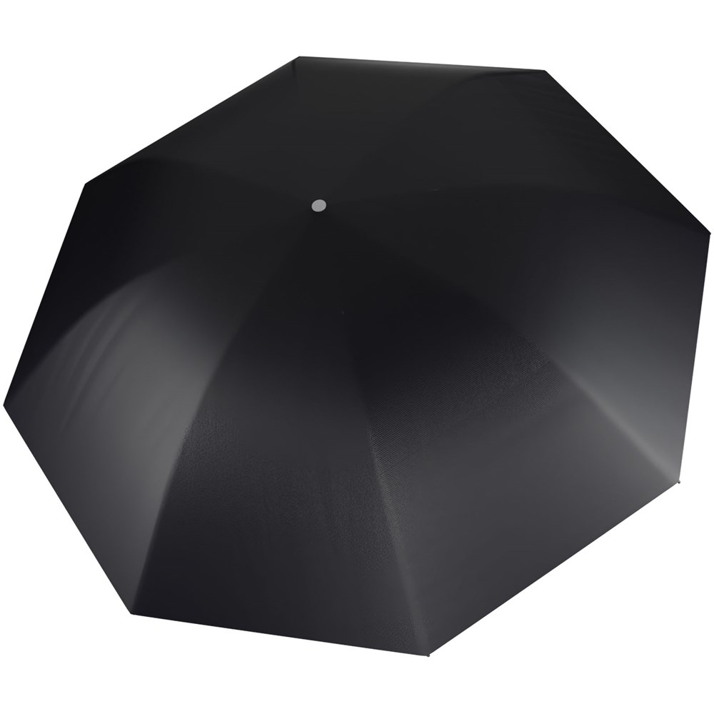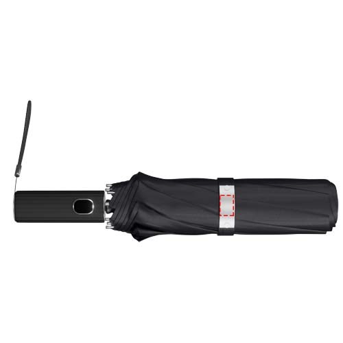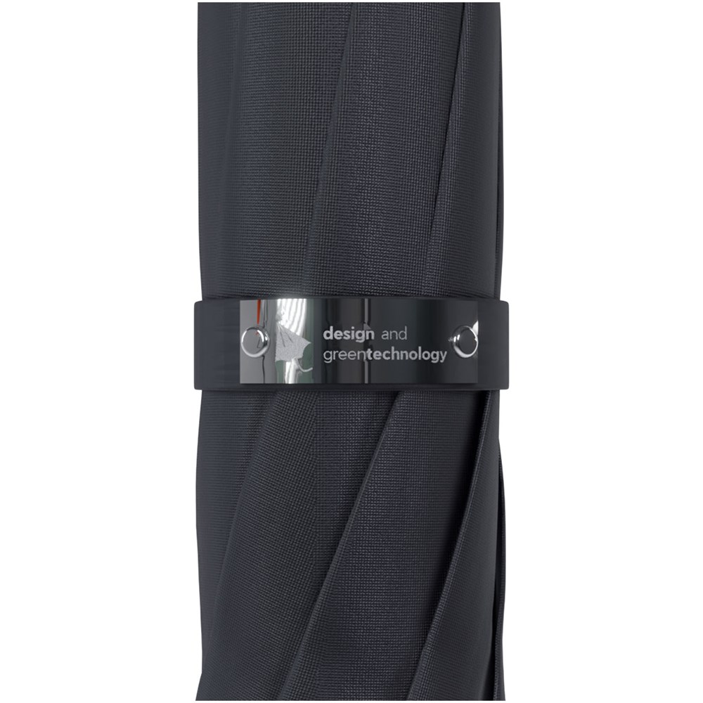 Halbautomatisch faltbarer Regenschirm aus rPET 210T Pongee und einem Glasfasergestell. Soft-Touch-Griff mit integriertem Druckknopf zum schnellen Öffnen und Schließen. Winddichtes System für bessere Windbeständigkeit dank des flexiblen Gestells. Dieses Produkt kann auf der exklusiven Metallplatte individuell gestaltet werden. Wird mit einer Schirmtasche geliefert und in einer zylindrischen Geschenkbox aus recyceltem Papier (32 × 6,5 cm).